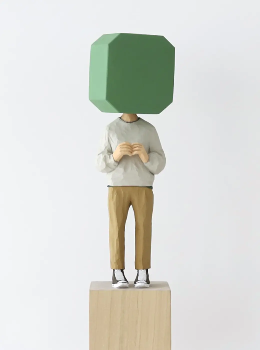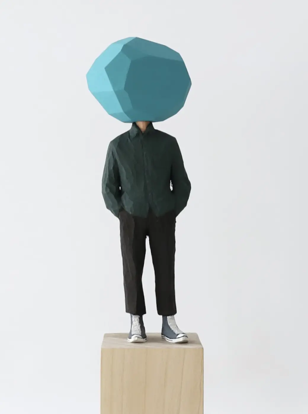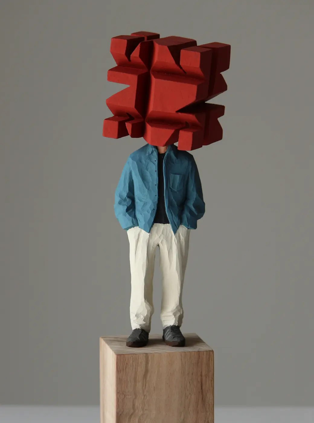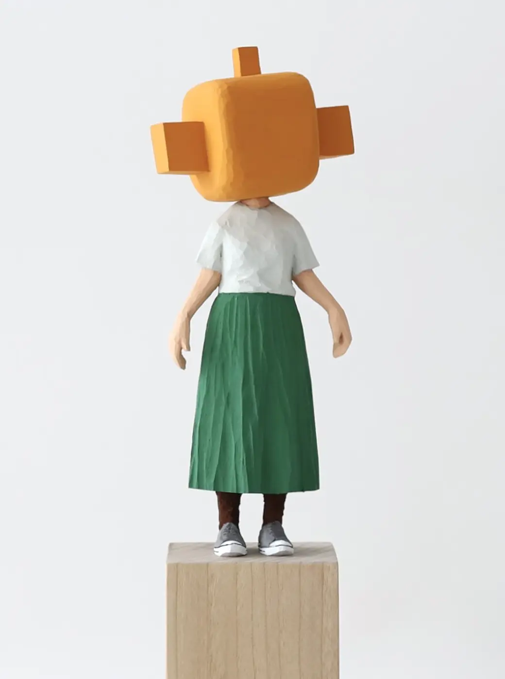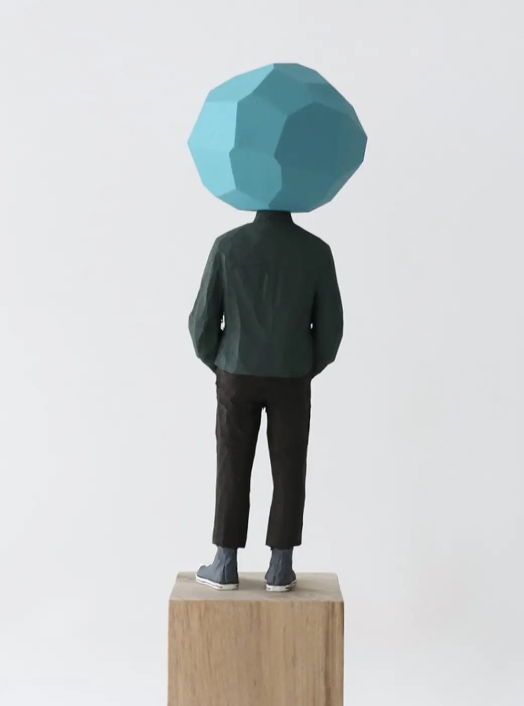 頭部に顔はなく、カラフルで幾何学的な立体を載せています。