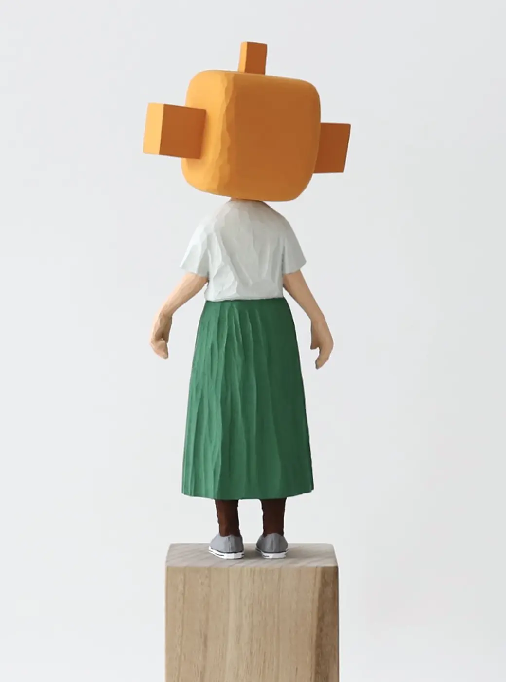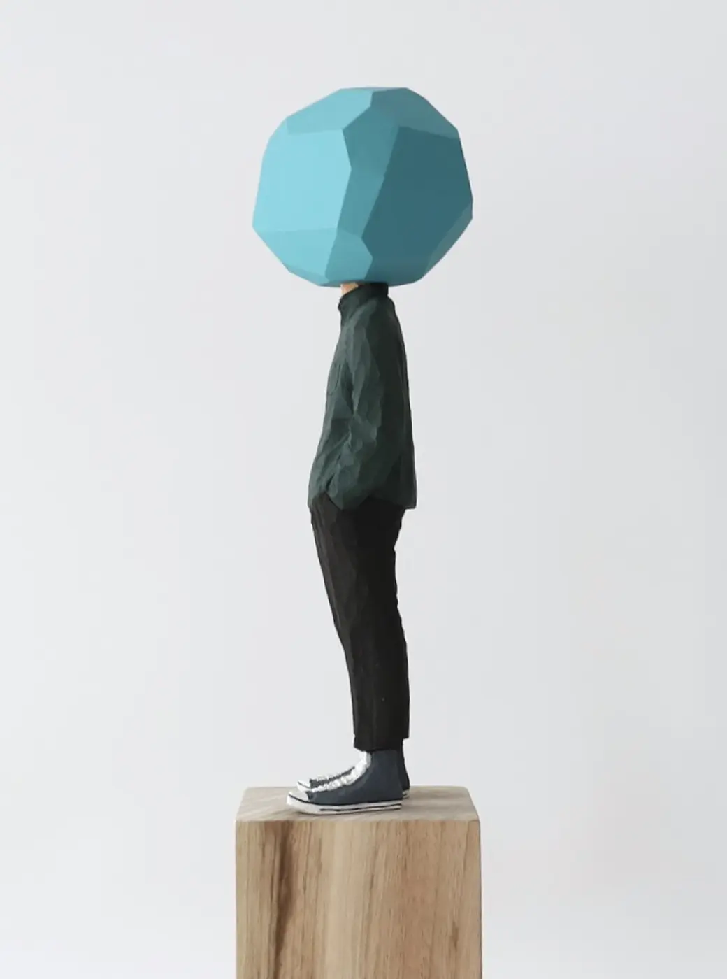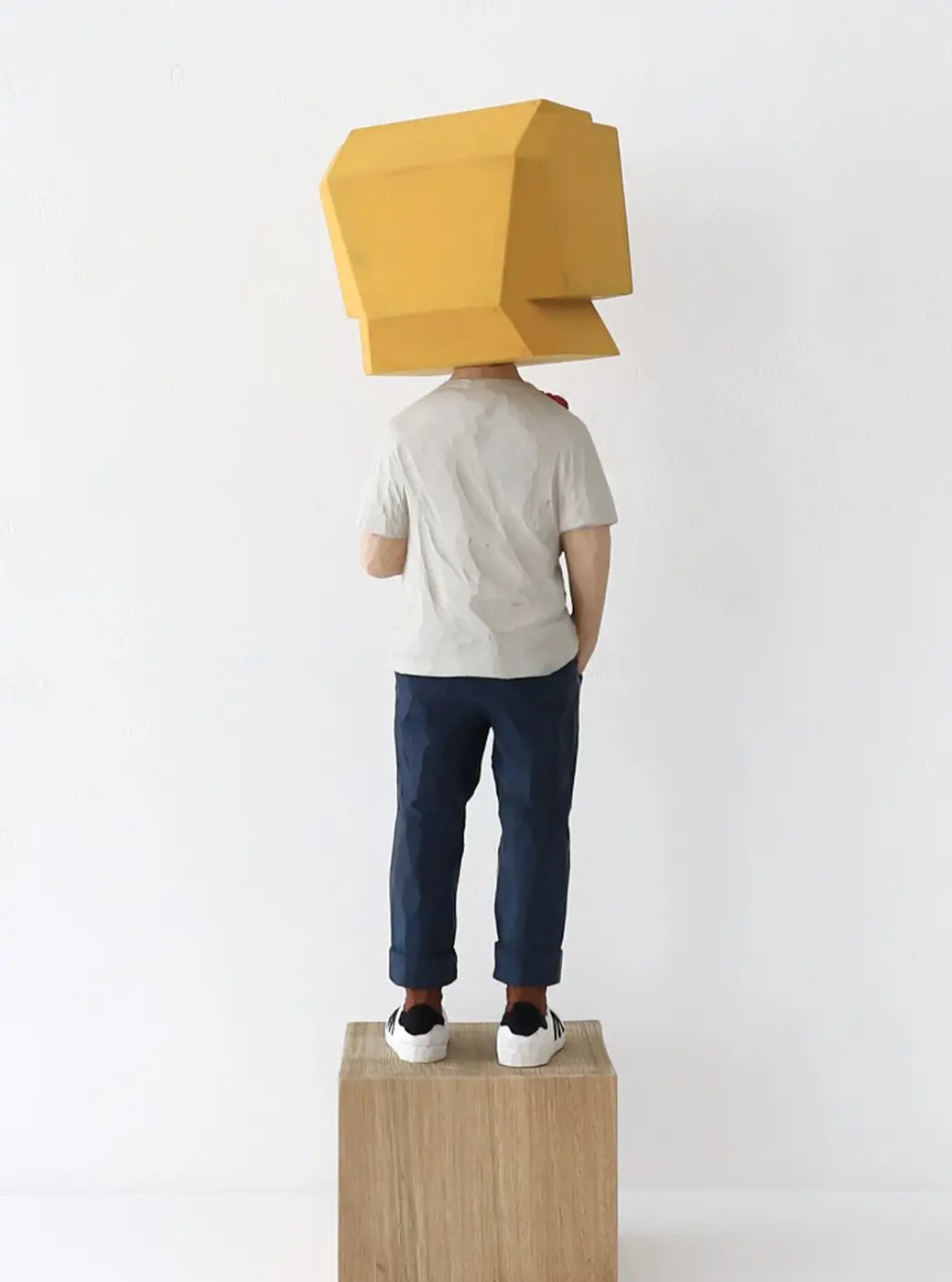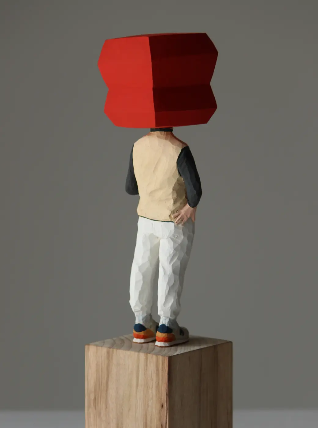 頭部に顔はなく、カラフルで幾何学的な立体を載せています。