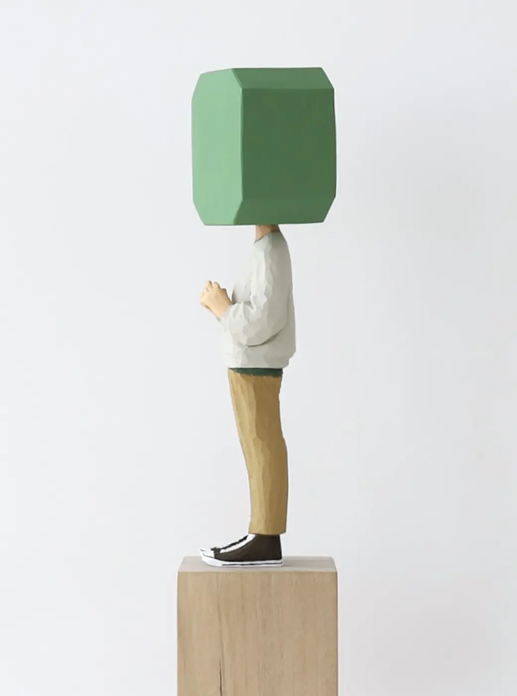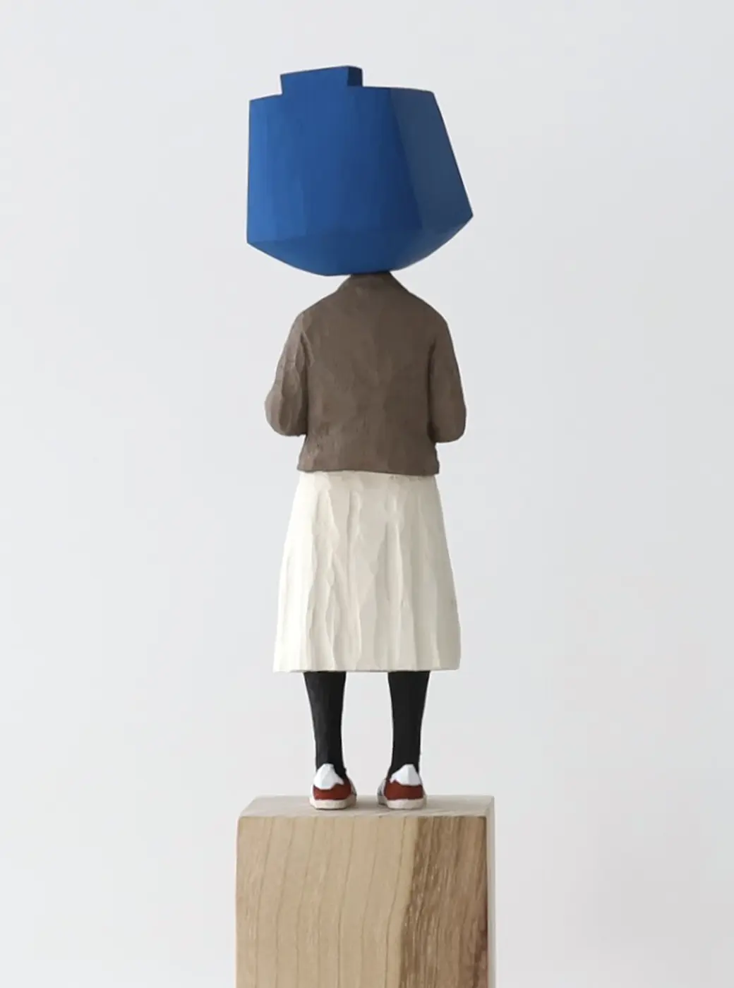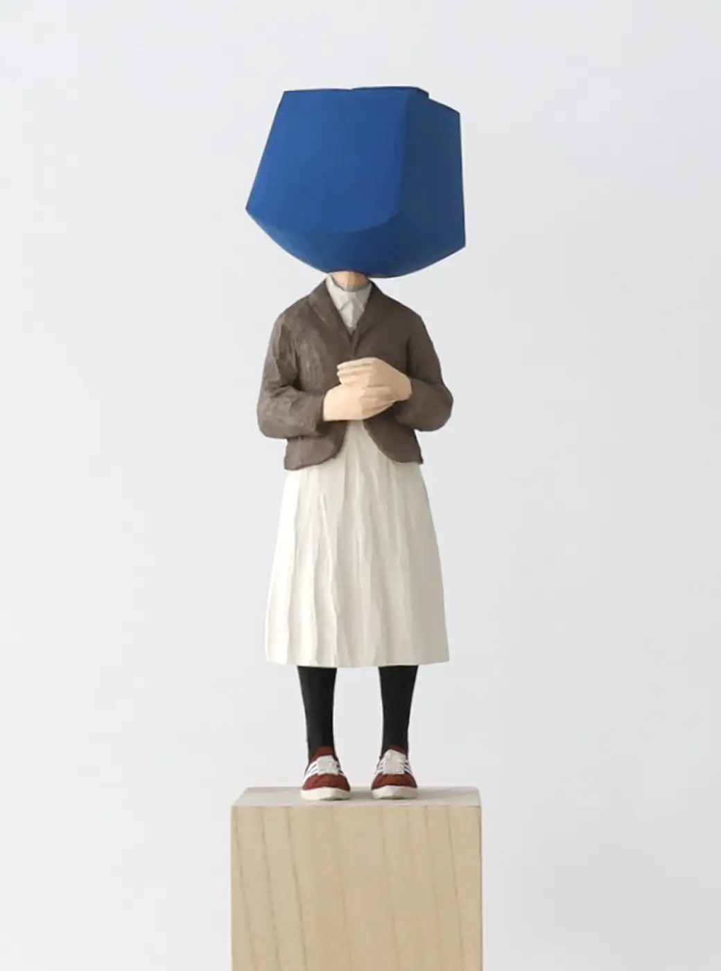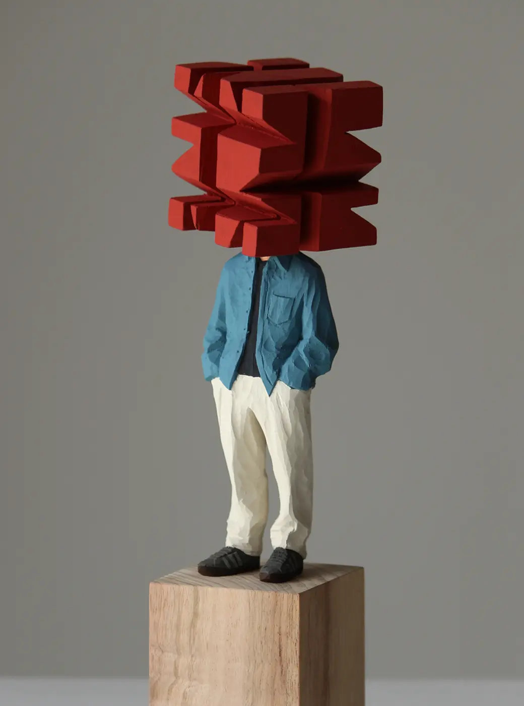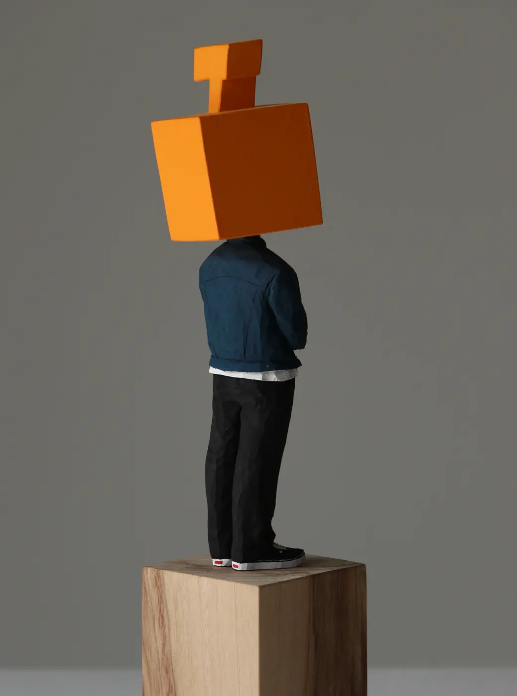 頭部に顔はなく、カラフルで幾何学的な立体を載せています。