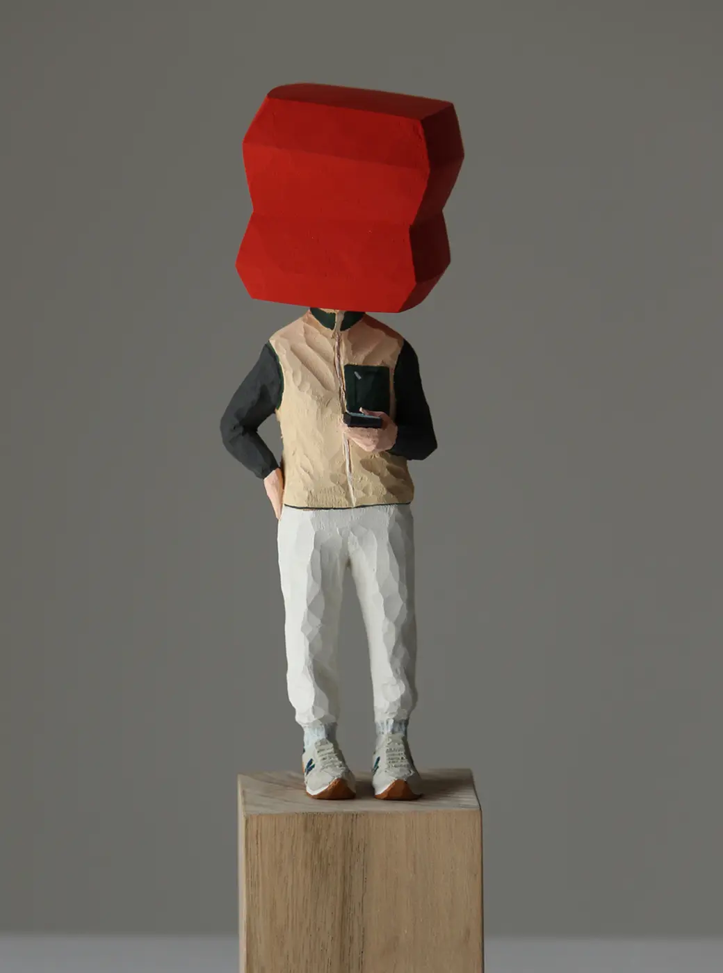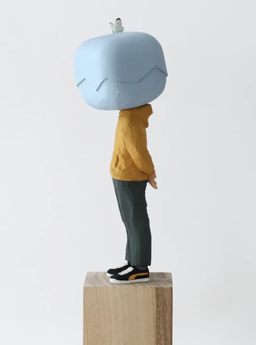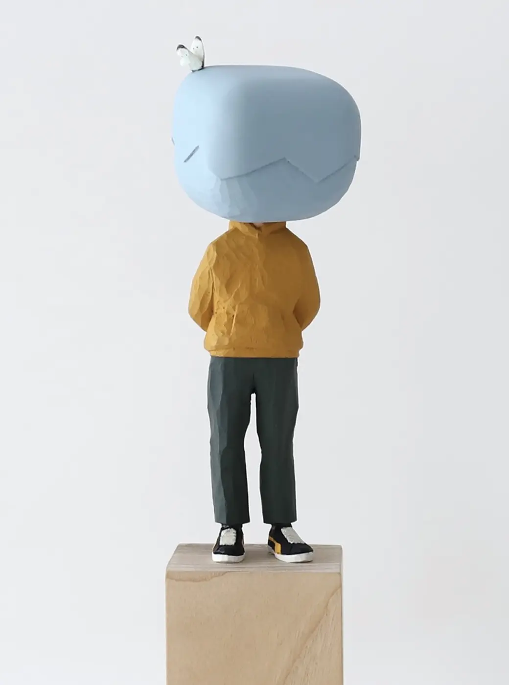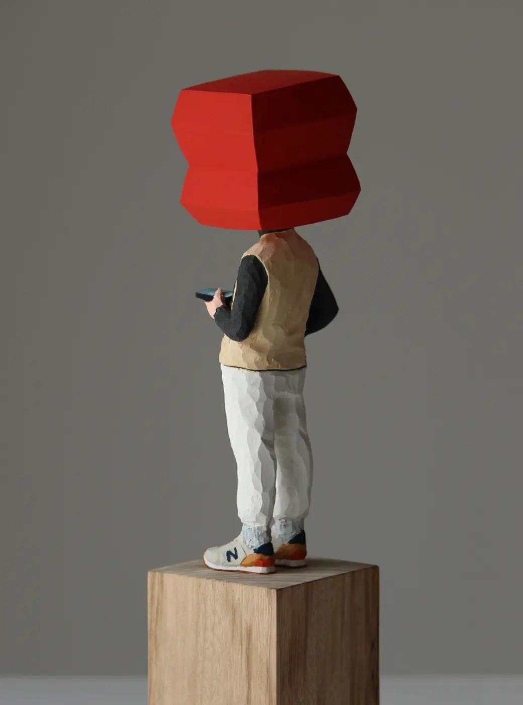 頭部に顔はなく、カラフルで幾何学的な立体を載せています。
