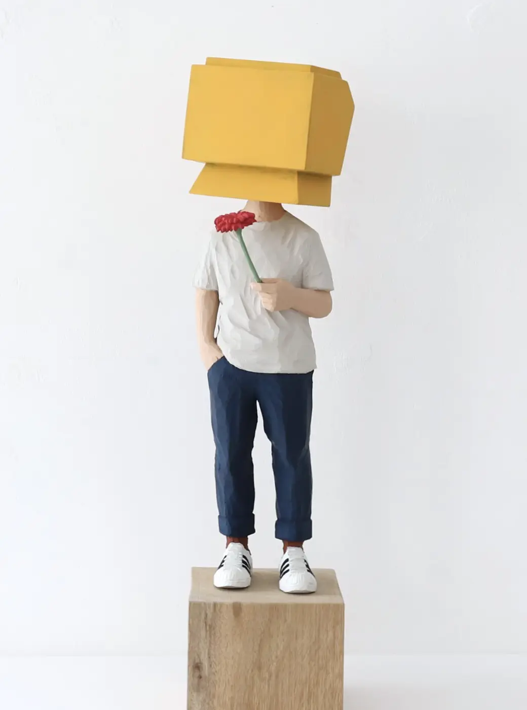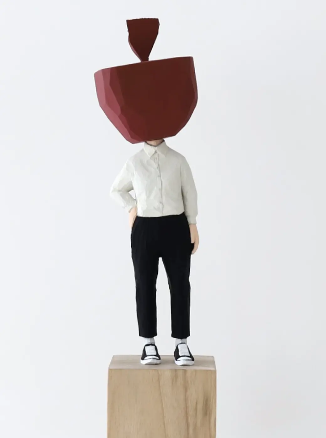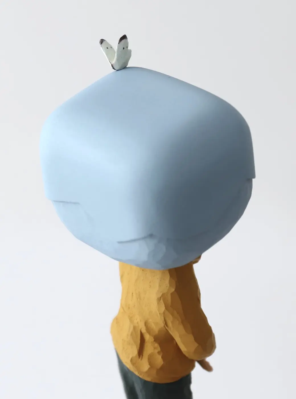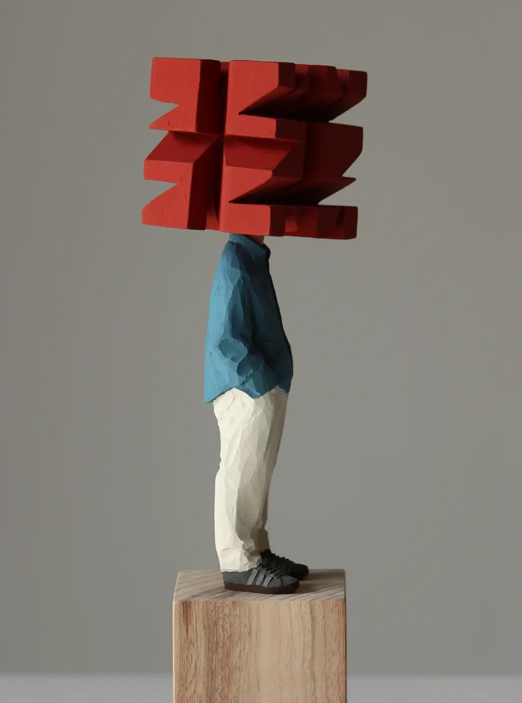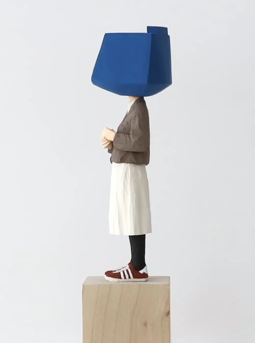 頭部に顔はなく、カラフルで幾何学的な立体を載せています。