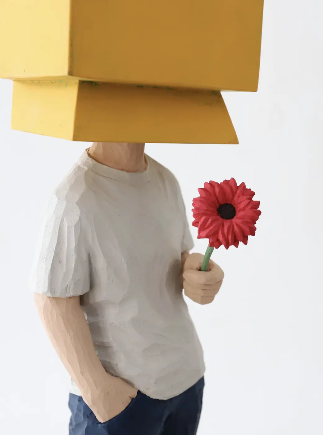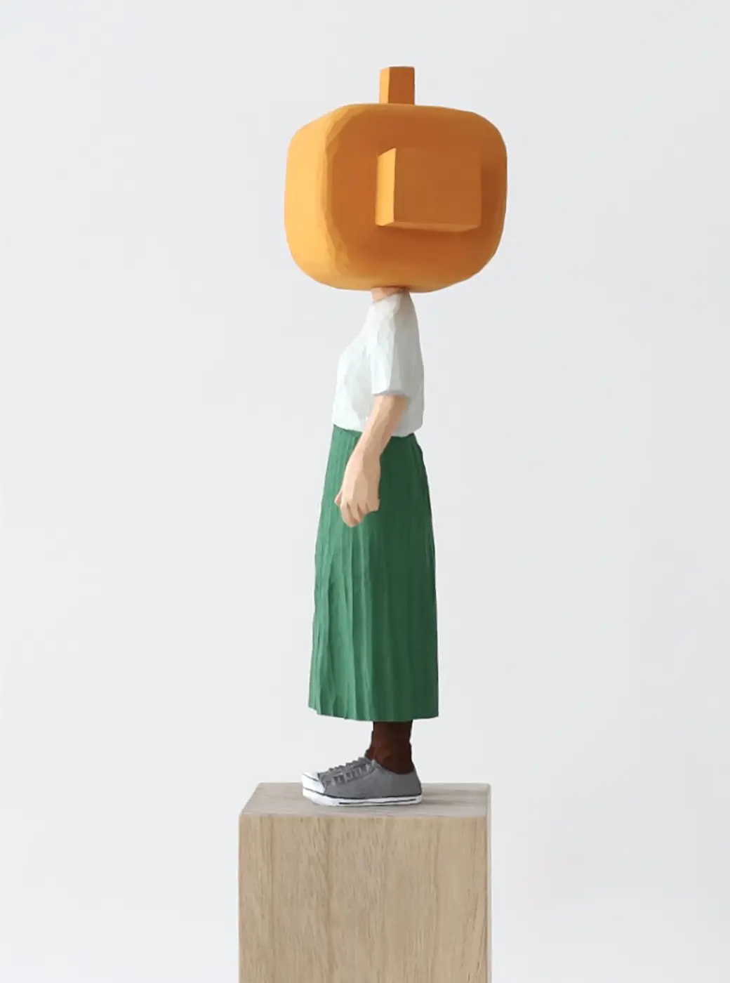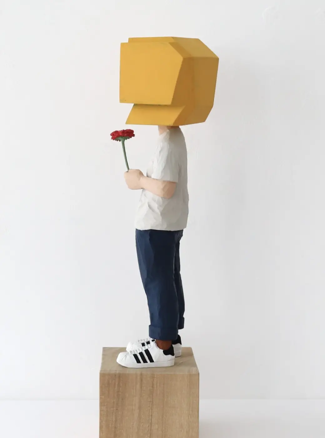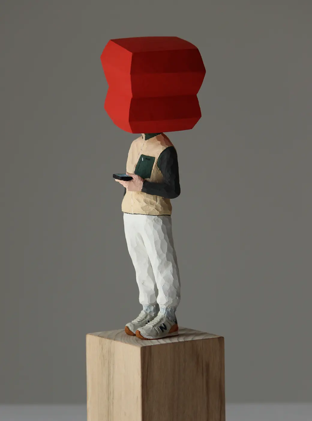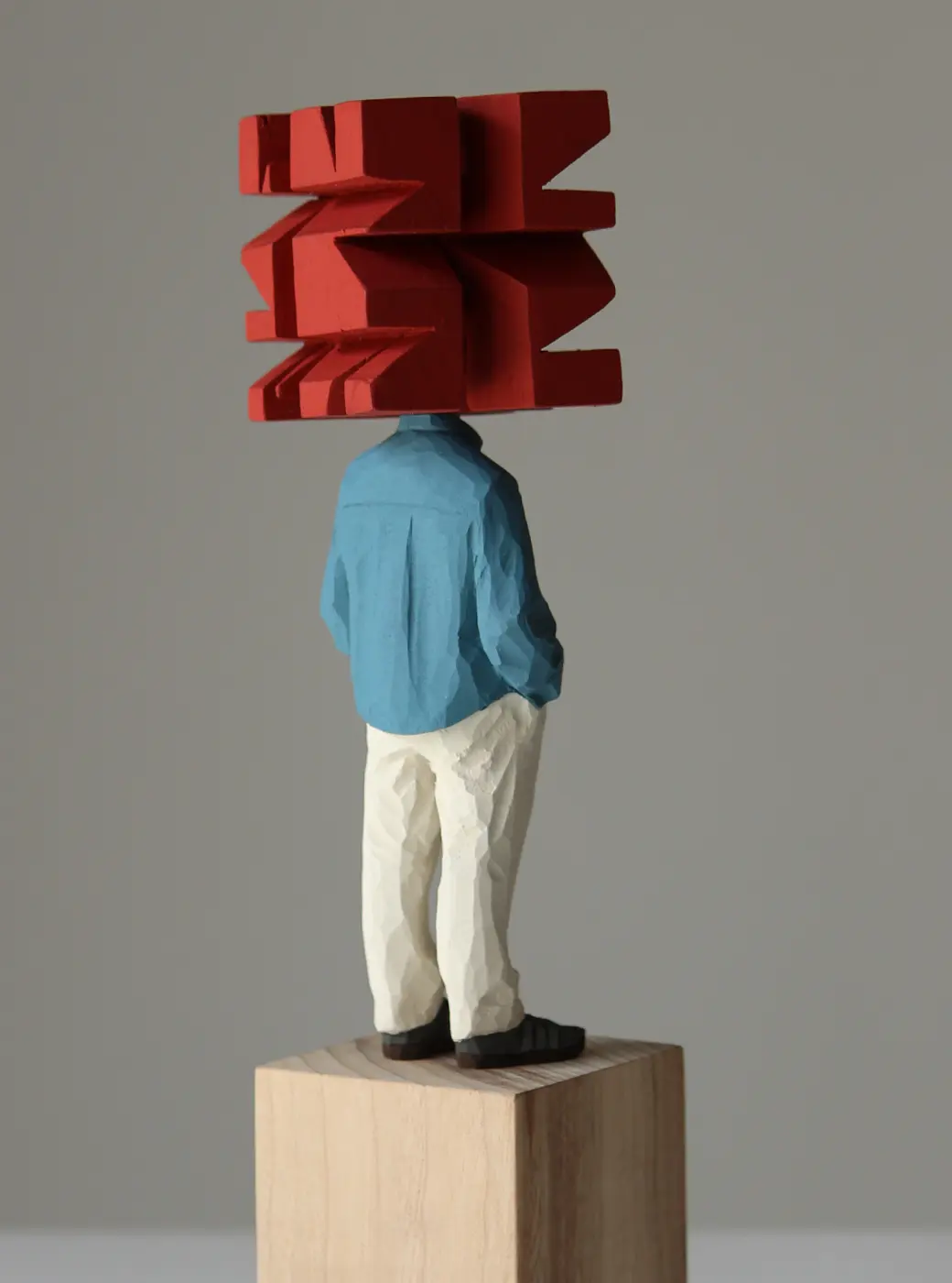 頭部に顔はなく、カラフルで幾何学的な立体を載せています。
