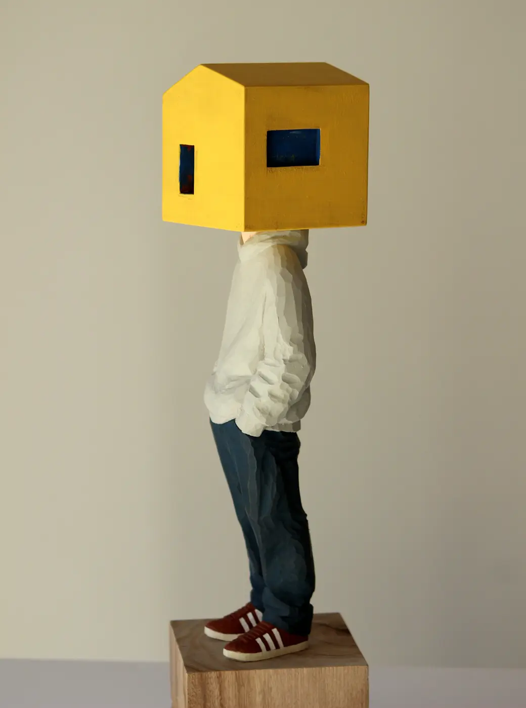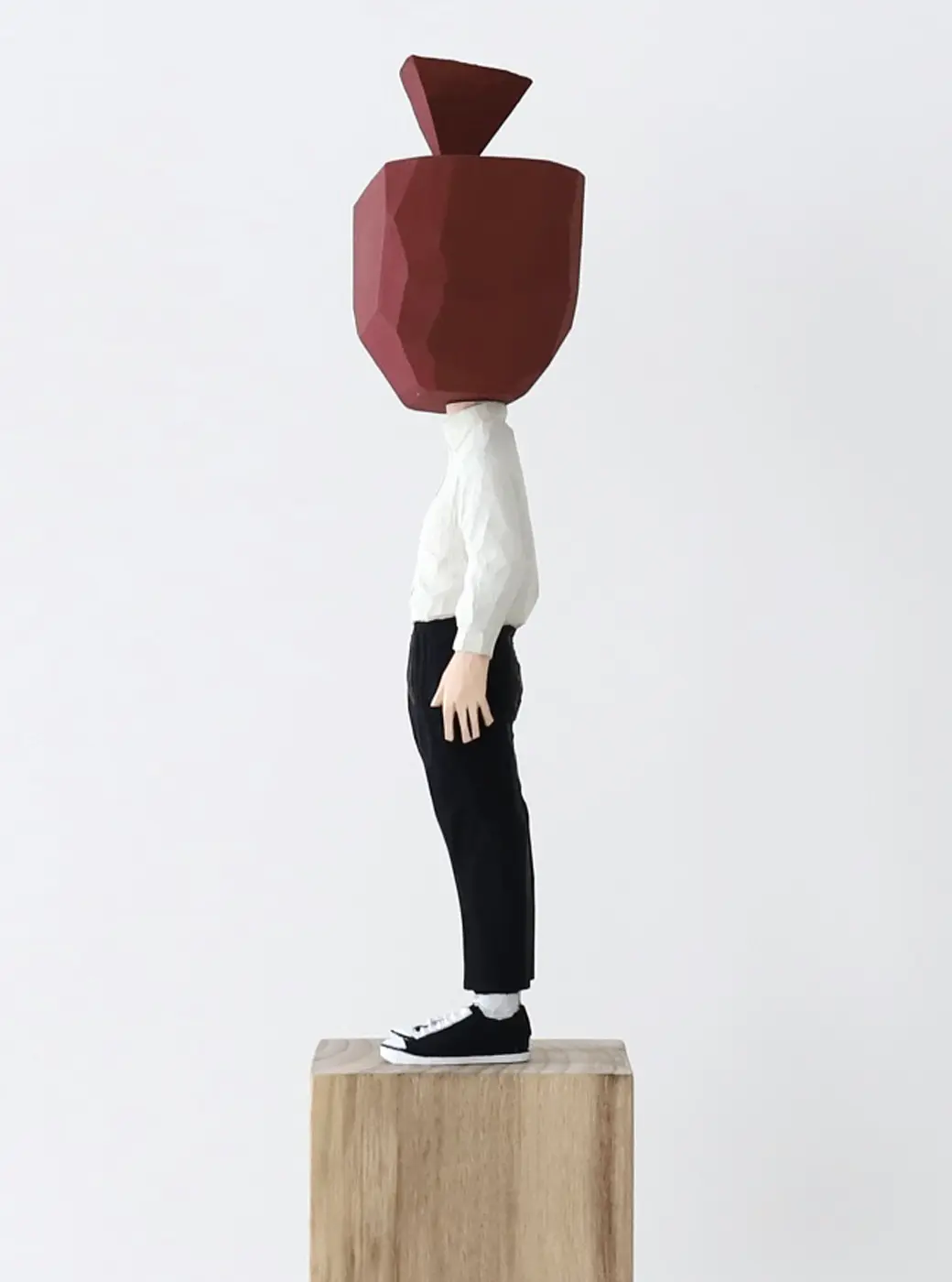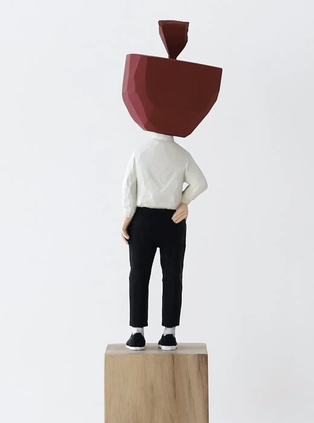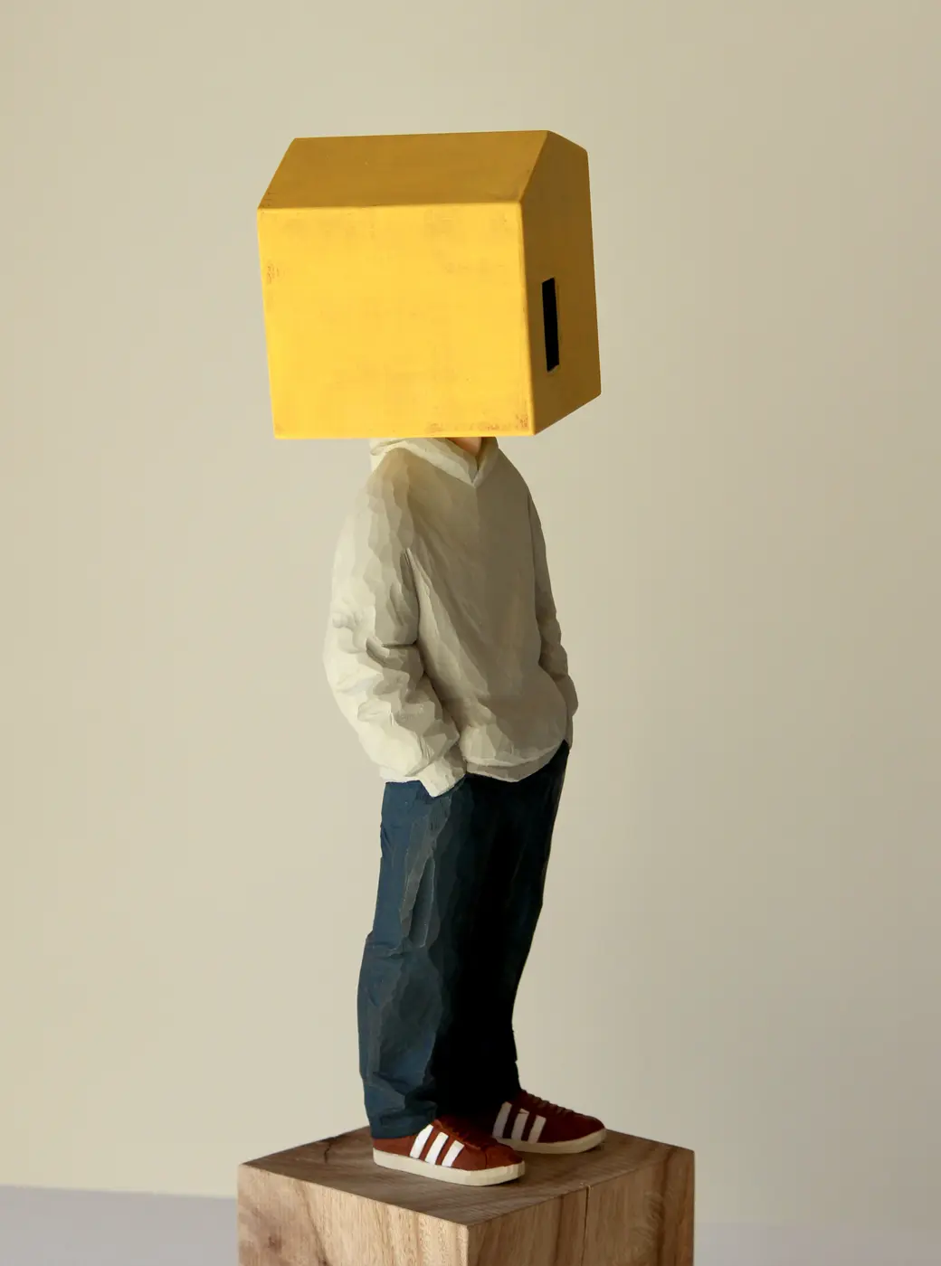 頭部に顔はなく、カラフルで幾何学的な立体を載せています。