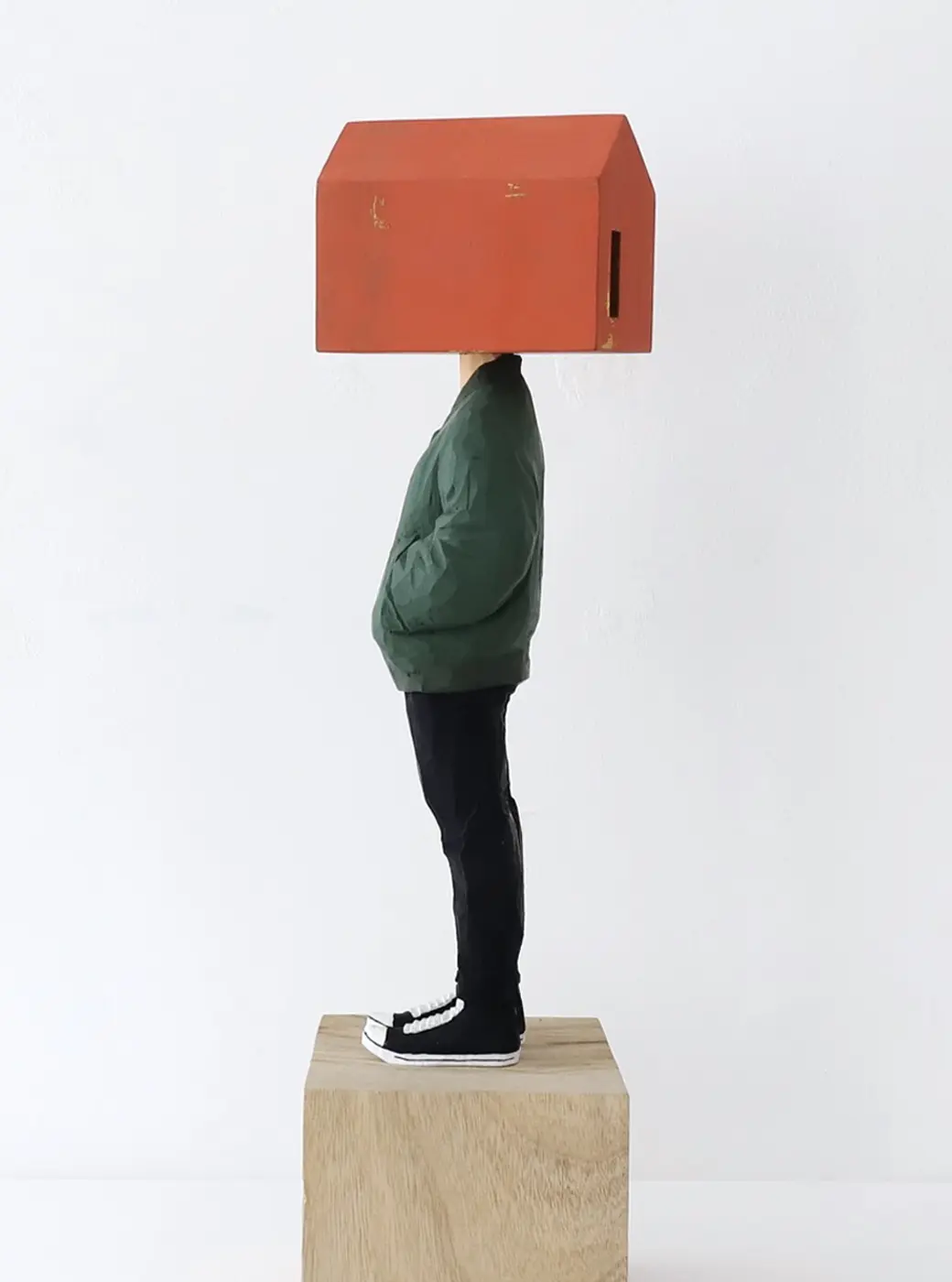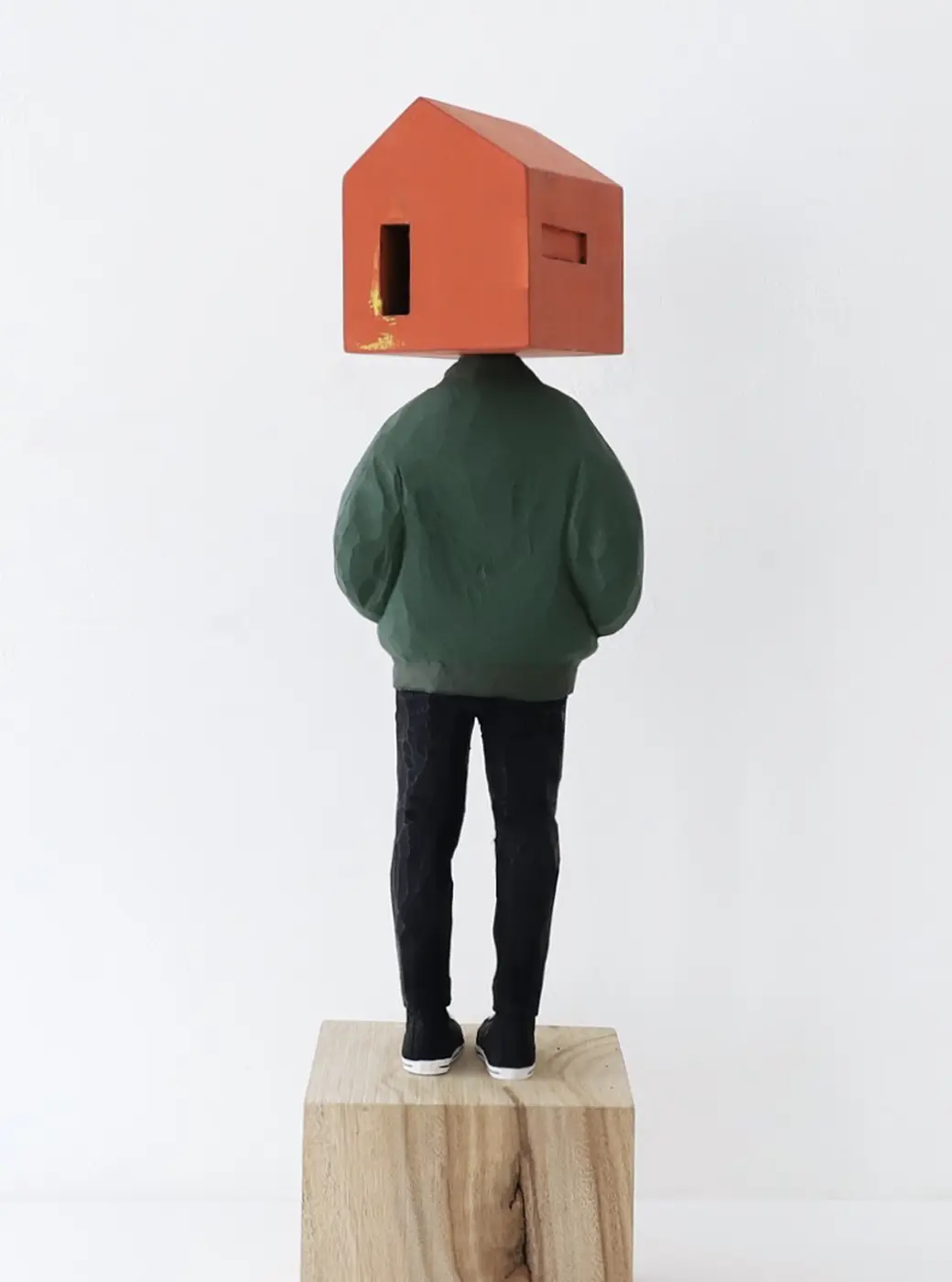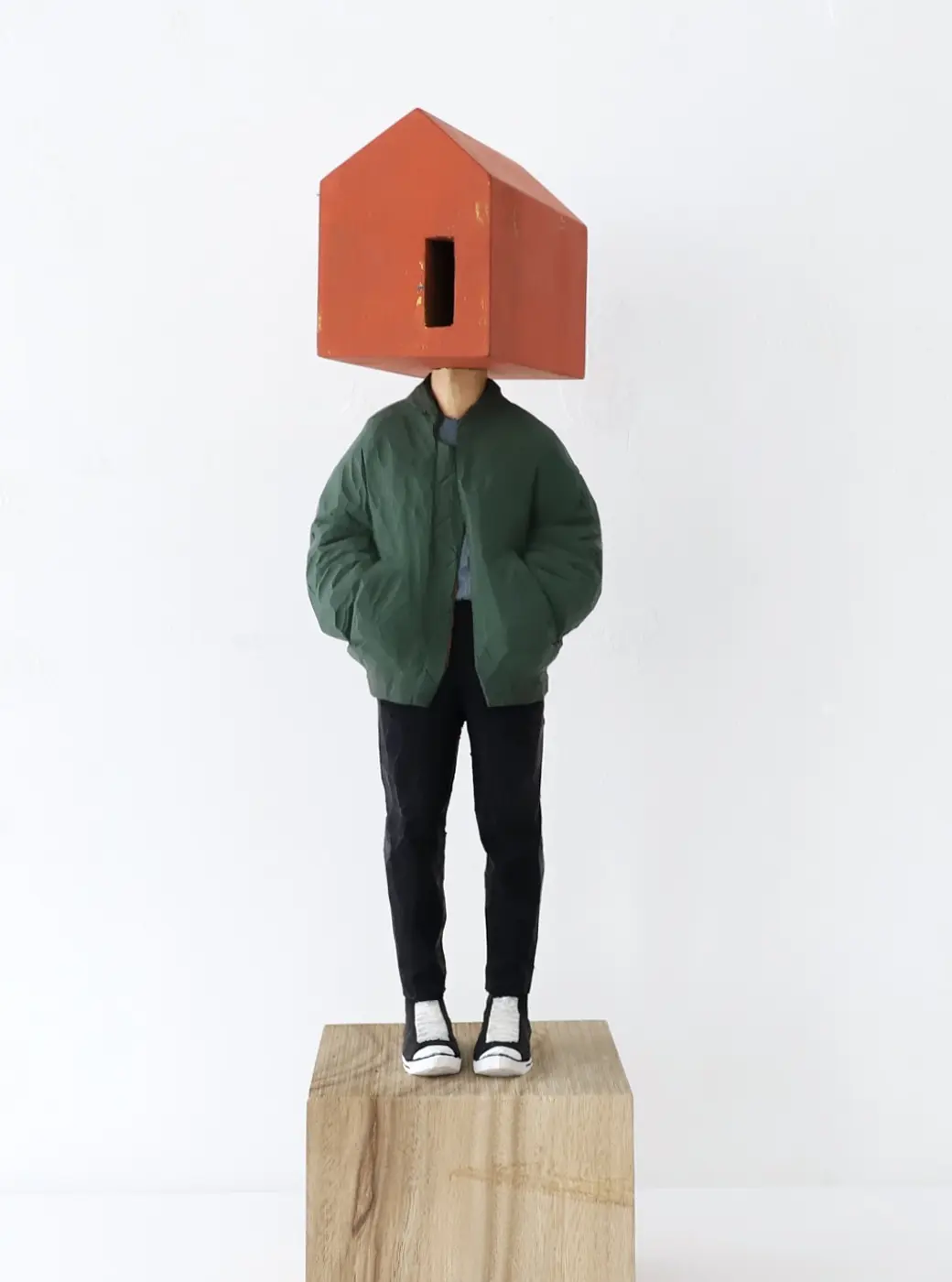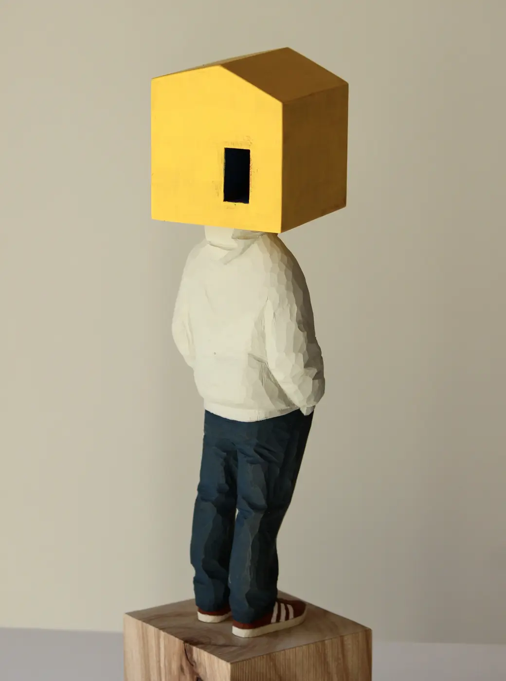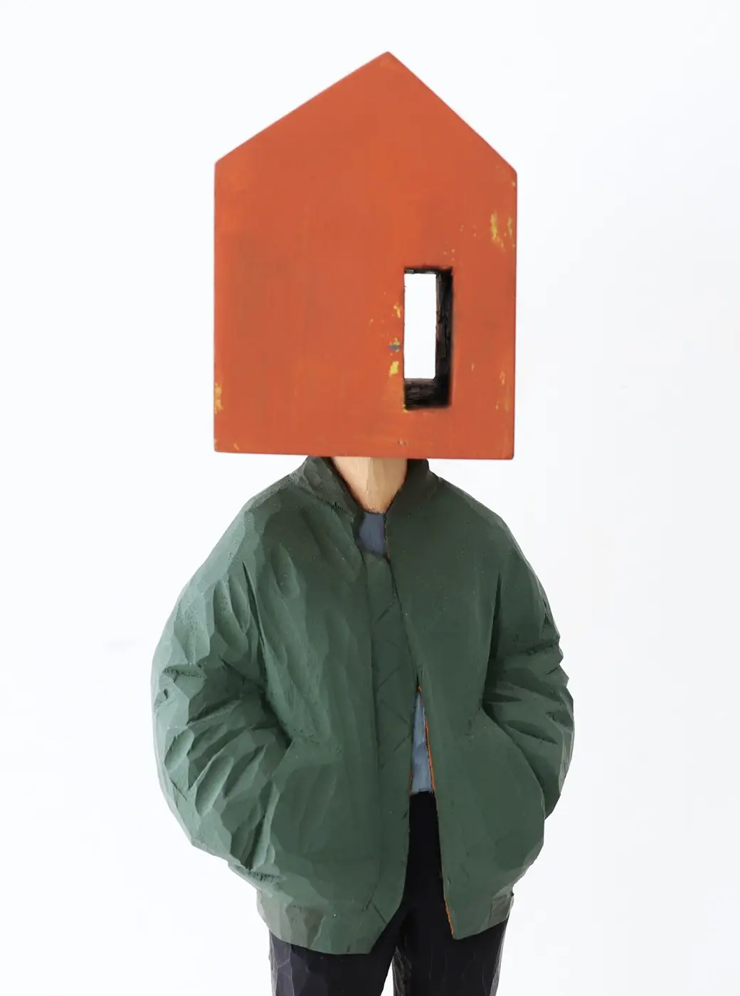 頭部に顔はなく、カラフルで幾何学的な立体を載せています。